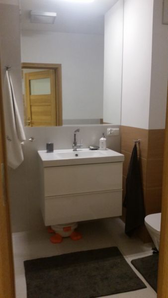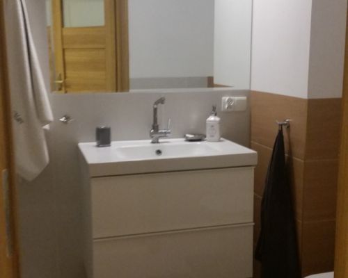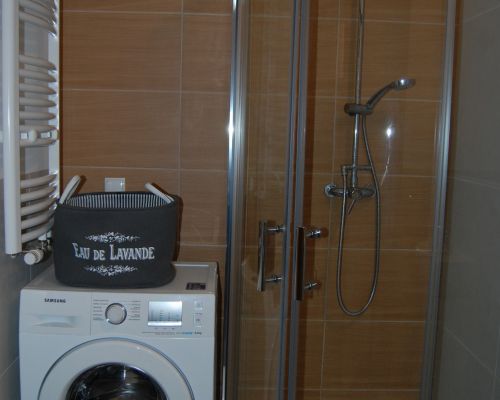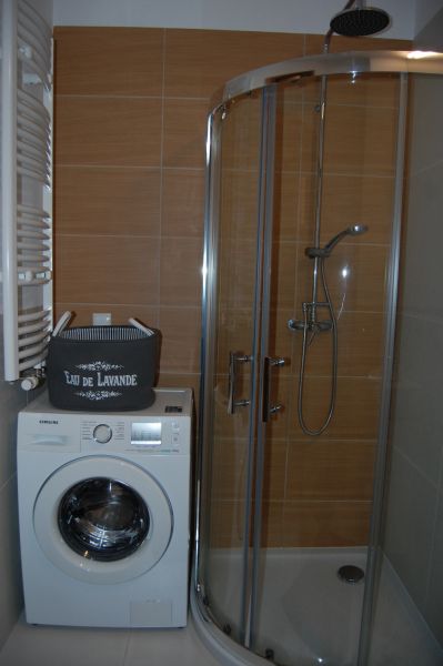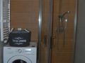 Regendusche, Waschbecken mit einem großen Spiegel, ausgestattet mit: Waschmaschine, Bügelbrett, Bügeleisen, Trockener, Fön, Staubsauger, Handtücher