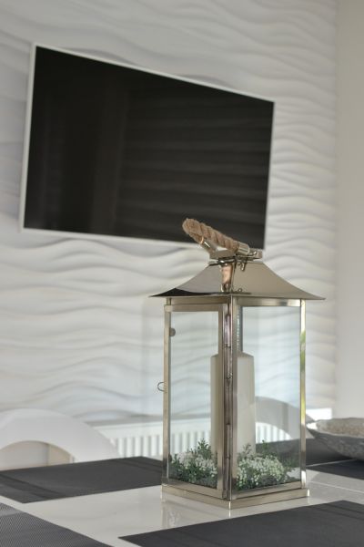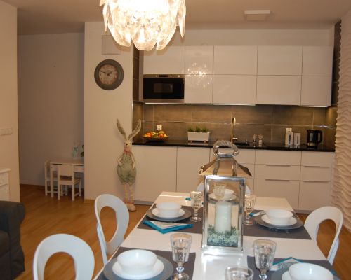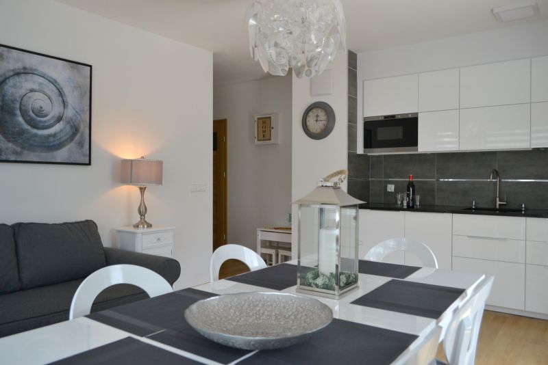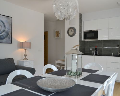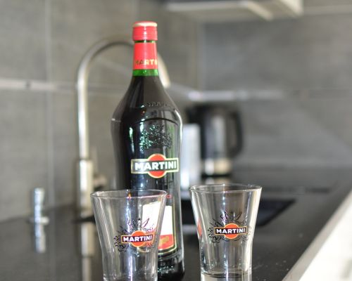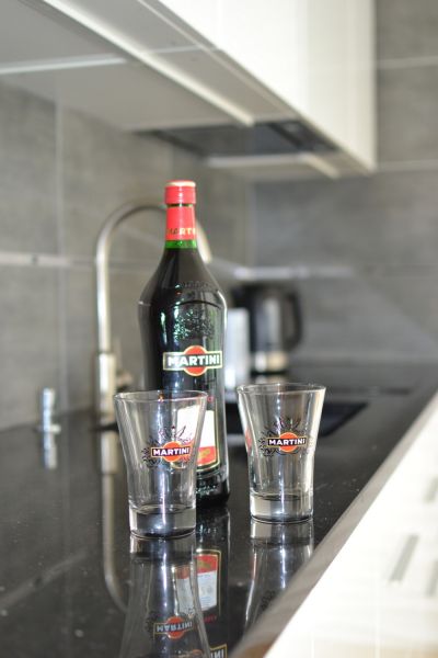 Ausgestattet mit: Spülmaschine, Kühlschrank mit Gefrierfach, Induktionsherd, Dunstabzugshaube, Wasserkocher, Mikrowelle, Küchenutensilien und Geschirr, Flaschenwärmer für Babys, Hochstuhl für Babys