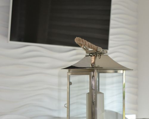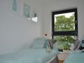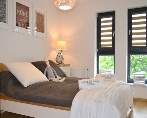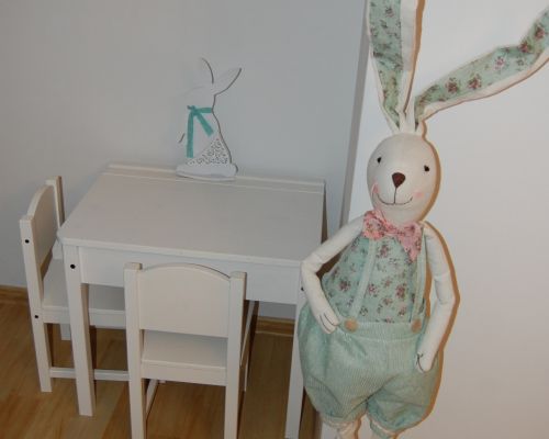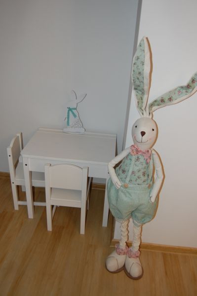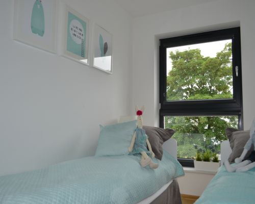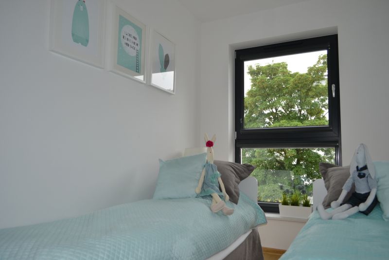 - zweites Schlafzimmer: zwei kontinentale Einzelbetten mir einer Breite von 80 cm, die verbunden werden können, ein Schrank mit Nachttischlampe, Regal in der Form eines Hauses.