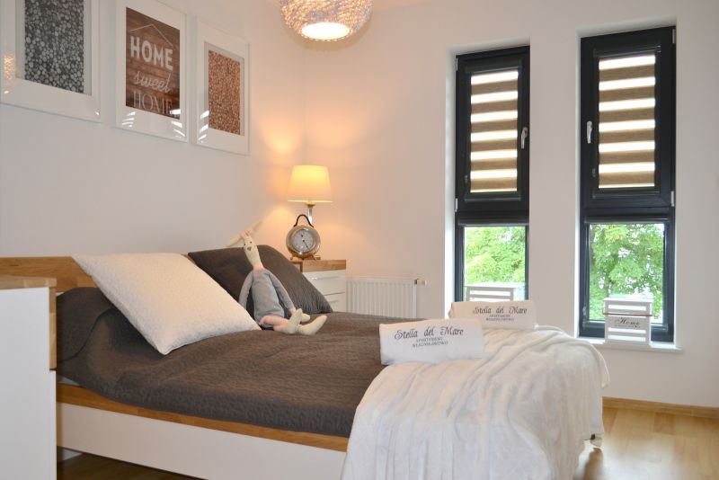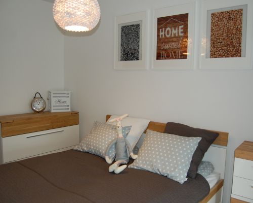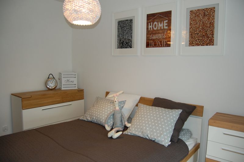 - erstes Schlafzimmer: ein Doppelbett mit einer Breite von 160 cm, Kommode, Schrank mit einer Nachttischlampe, Reisebett für das Baby