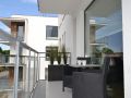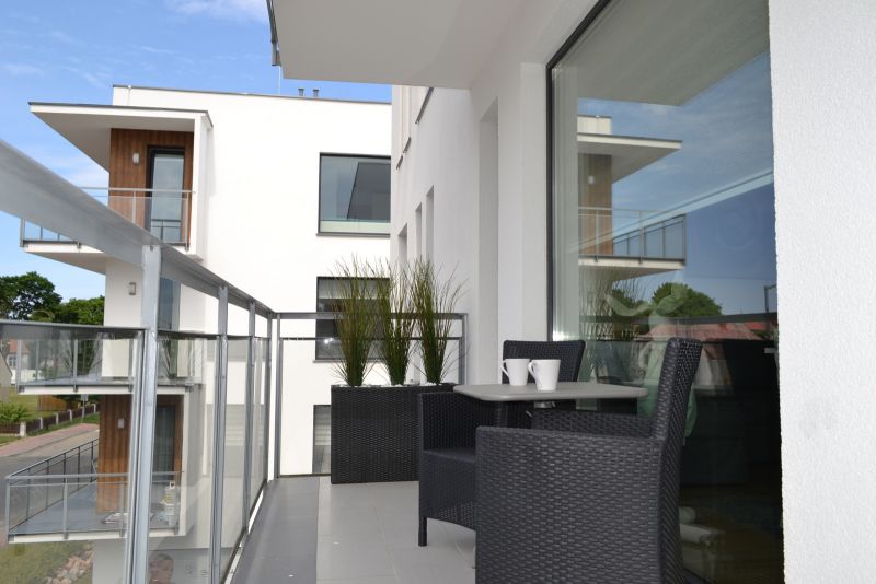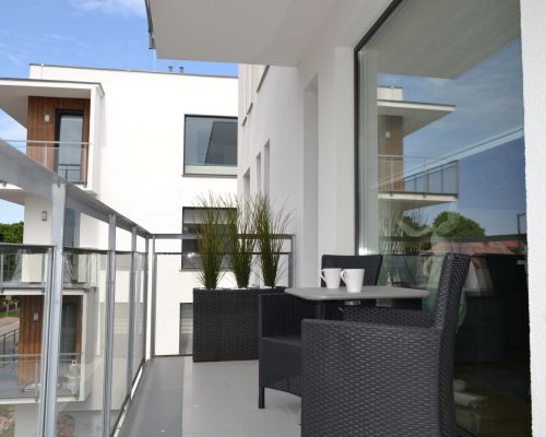 Ein großer Balkon-Terrasse mit Rattan-Sesseln, Couchtisch