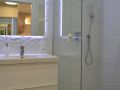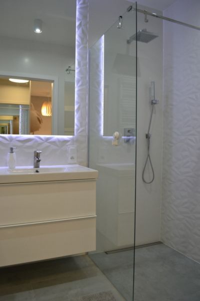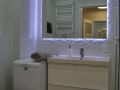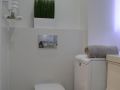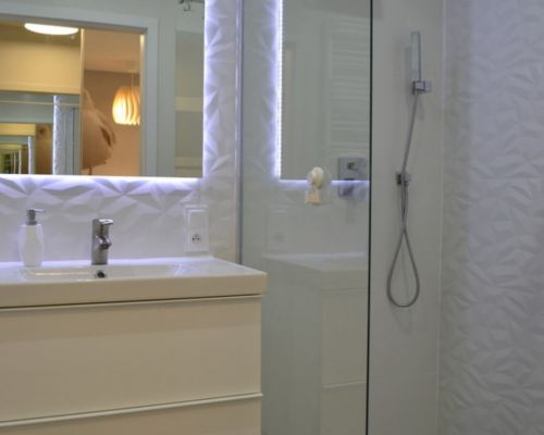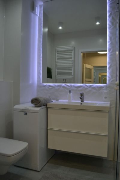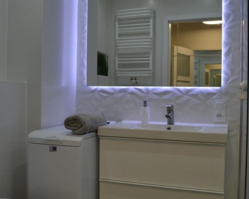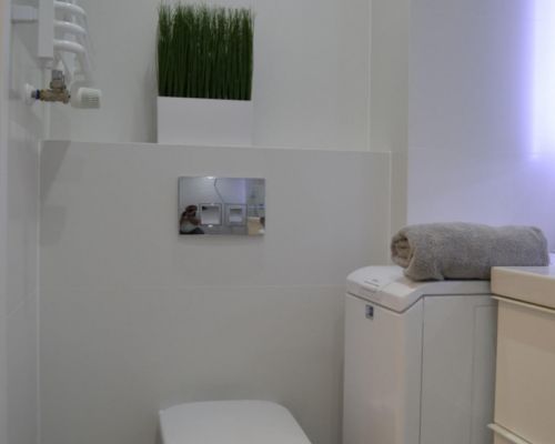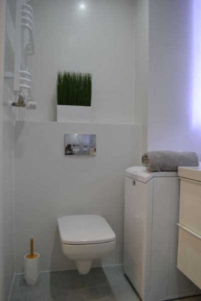 Kabina prysznicowa, umywalka z lustrem, pralka, deska do prasowania, żelazko, suszarka do prania, suszarka do włosów, ręczniki, odkurzacz.