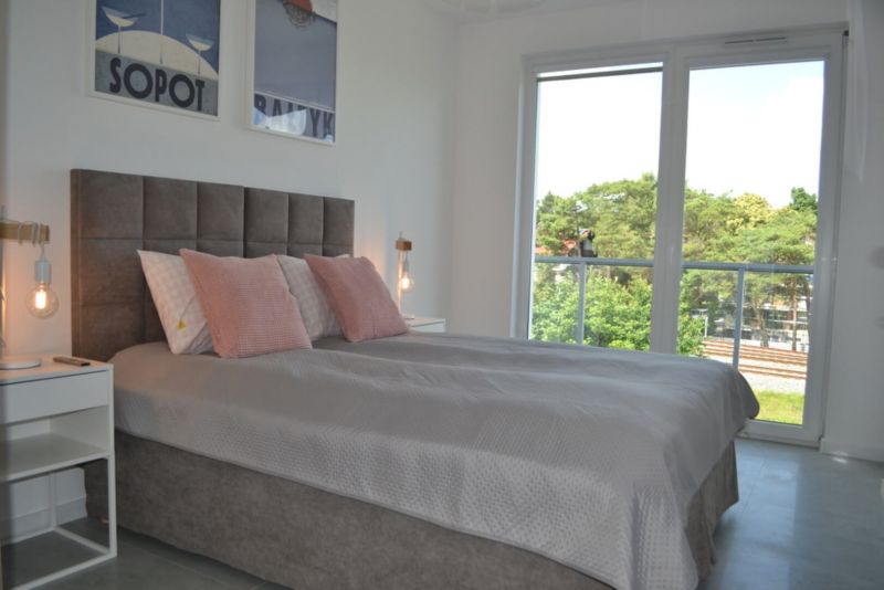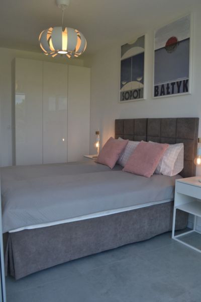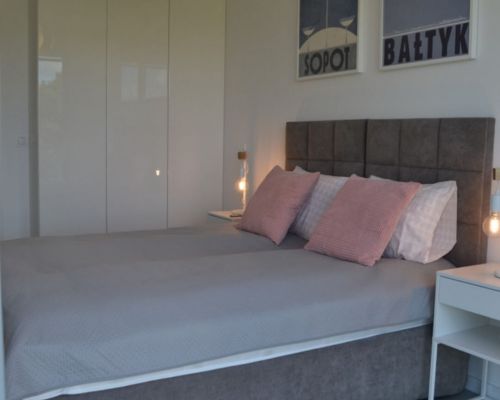 2 łóżka, szafa, 2 szafki z lampką nocną, TV 4K.